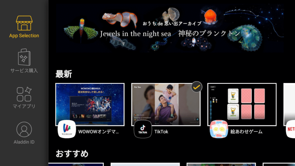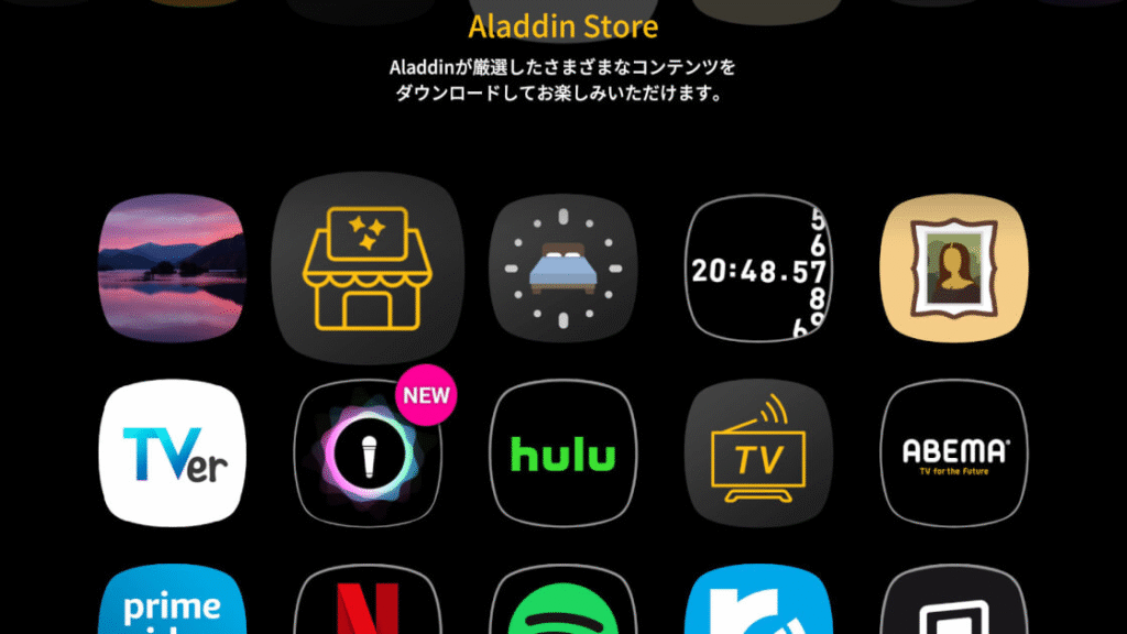 ポップインアラジン2を起動すると、専用のホーム画面が表示されます。ここにはYouTubeやNetflixなど、人気アプリのショートカットが並んでいます。
