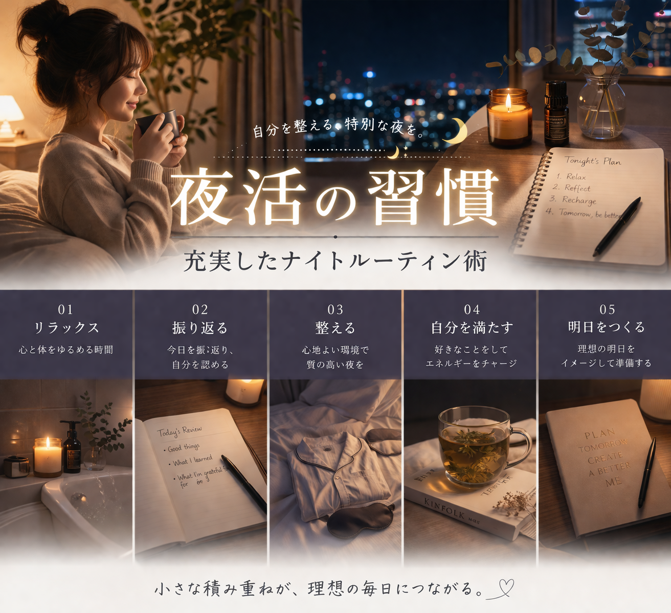 夜の時間を有効に使いたい人ほど、実は「何を足すか」よりも「何を引くか」が大切です。睡眠は気分、注意力、記憶、翌日のパフォーマンスに深く関わっており、公的な睡眠ガイドでも、就寝前はいつも近い時刻に眠ること、寝室を暗く静かで涼しく整えること、電子機器を切ること、大きな食事やアルコールを避けることが勧められています。つまり良い夜活とは、夜更かしして頑張ることではなく、心と体をうまく鎮めて「最高の朝」を迎える準備をすることです。