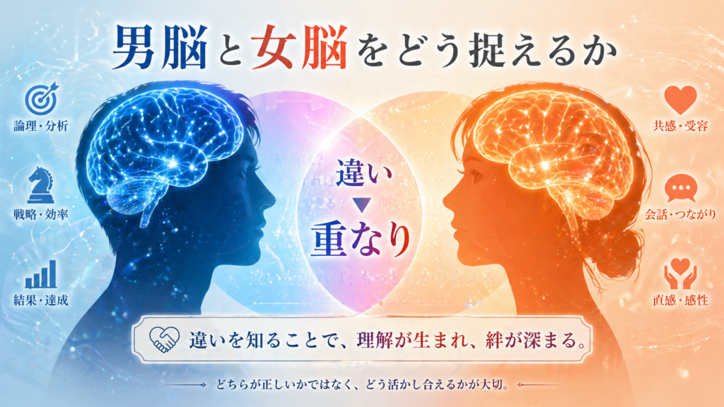 この記事では、「男脳」「女脳」を便利な俗語としては使いながらも、実際には“男性に比較的多い傾向”“女性に比較的多い傾向”という意味で扱います。つまり、男性でも共感重視の人はいますし、女性でも結論重視の人はたくさんいます。大切なのは、性別で相手を決めつけることではなく、目の前の相手がどんな会話の受け取り方をしやすいのかを理解することです。近年の総説でも、認知や振る舞いの男女差は、生物学的要因だけでなく、社会化、役割期待、文化、経験が重なり合って形づくられると整理されています。