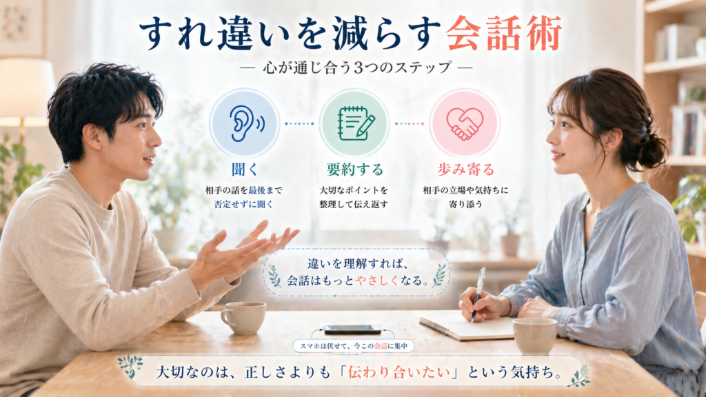 学生の恋愛でも、子育て中の夫婦でも、定年後のパートナー関係でも、すれ違いの核は驚くほど似ています。短く結論だけを話す人と、気持ちを整理しながら話したい人。すぐに答えを出したい人と、まず理解されたい人。このズレがかみ合わないと、「冷たい」「面倒くさい」「察してほしい」「責められている」といった不満に変わります。だから必要なのは、どちらが正しいかを決めることではなく、会話の前提を合わせることです。
