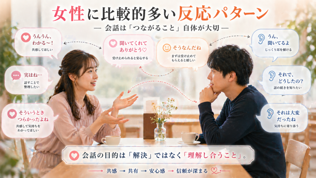 同じように、女性に比較的多い“関係を守るための会話”にも大きな価値があります。空気の変化に気づきやすい、相手の表情や言い回しの違和感を拾いやすい、言葉にしにくい感情を会話の中で扱える。こうした力は、問題が大きくなる前にズレを察知し、関係を修復するうえで非常に有効です。実際、関係の満足度を高める要素としては、理解、評価、安心感、親密さといった“感情の安全性”が繰り返し重視されています。共感型の会話は回り道に見えて、長期的には衝突のコストを下げる近道にもなります。