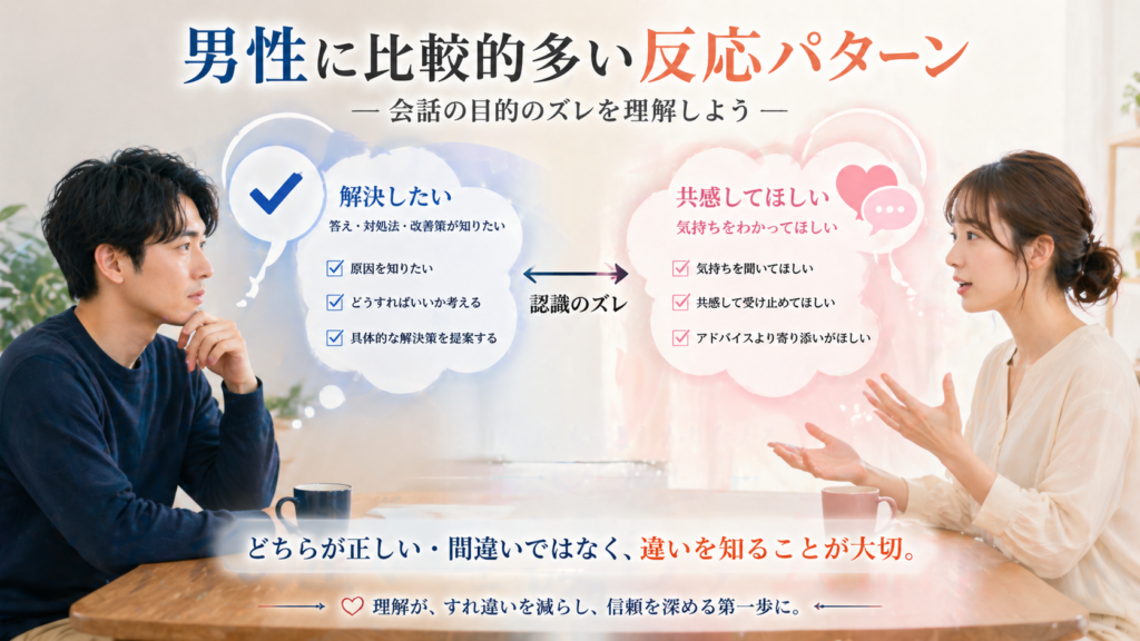 もう一つ、男性に比較的多いのは「好意はあるのに、共感の言葉が先に出にくい」パターンです。たとえば相手が「今日ほんとにつらかった」と言ったとき、「じゃあ転職を考えたら?」と返してしまう。本人からすれば“何とかして楽にしてあげたい”という親切でも、受け取る側は「気持ちをわかってくれなかった」と感じます。ここで必要なのは高い話術ではなく、順番を変えることです。結論より先に、「それはしんどかったね」「それは腹が立つよね」を一度置く。そのうえで「一緒に考える?」と聞ければ、男性の問題解決力は、ようやく相手の助けになります。