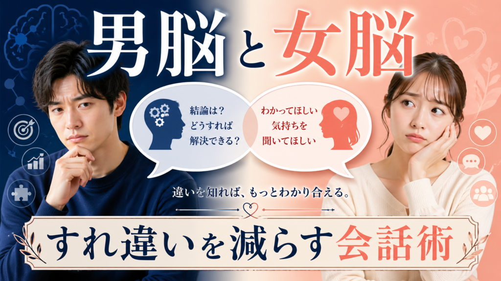 もしあなたがこれまで、「どうしてわかってくれないの?」と何度も感じてきたなら、悪いのはあなたの伝え方だけでも、相手の性格だけでもありません。単に、会話の初期設定がずれていただけかもしれません。男脳・女脳という言葉は、そのズレを知る入口としては役立ちます。けれど、本当に関係を変えるのは、その先にある小さな実践です。共感か解決かを確認すること。要約してから返すこと。スマホを置いて向き合うこと。そして、相手の違いを、自分を否定するものではなく、関係を深くするヒントとして扱うこと。そうできたとき、男女の違いは“衝突の原因”ではなく、“補い合える資源”に変わっていきます。
