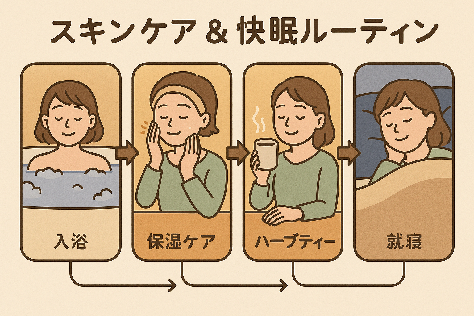 - 入浴で体を温める: 就寝の1〜2時間前にぬるめのお湯(約38~40℃)にゆっくり浸かりましょう。湯船に浸かることで血行が良くなり、深部体温が一度上がった後に下がる過程で自然な眠気が訪れます。保湿入浴剤を入れて肌を守りつつリラックスするのも◎。ただし長湯はかえって乾燥を招くため15~20分程度に留めます。