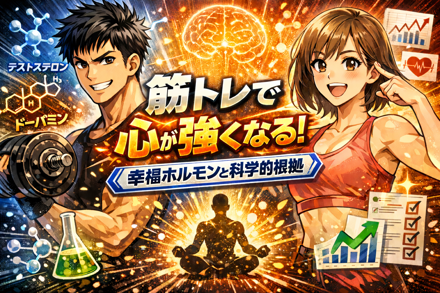 筋トレは身体を鍛えるだけでなく、心の健康にも大きなメリットをもたらします。テストステロンやドーパミン、セロトニン、成長ホルモンなどの分泌によって、幸福感ややる気の向上、ストレス耐性の強化などが期待できます。最近の研究でも、筋トレ習慣が不安や抑うつ症状の緩和に有効であることが示されています。